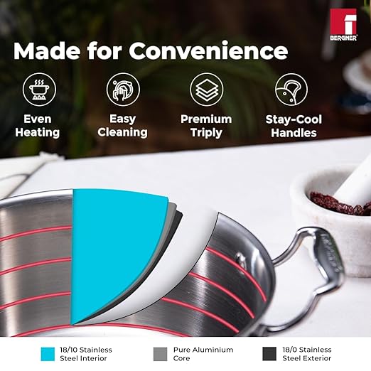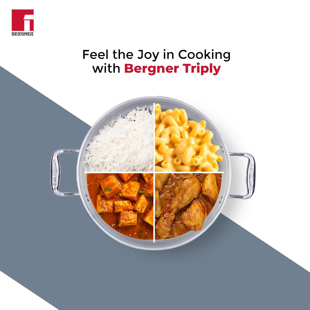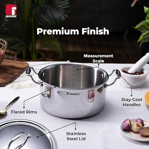 Bergner Argent Tri-Ply Stainless Steel Casserole with Stainless Steel Lid (24 cm, 5.3 Litres, Induction Base, Silver)