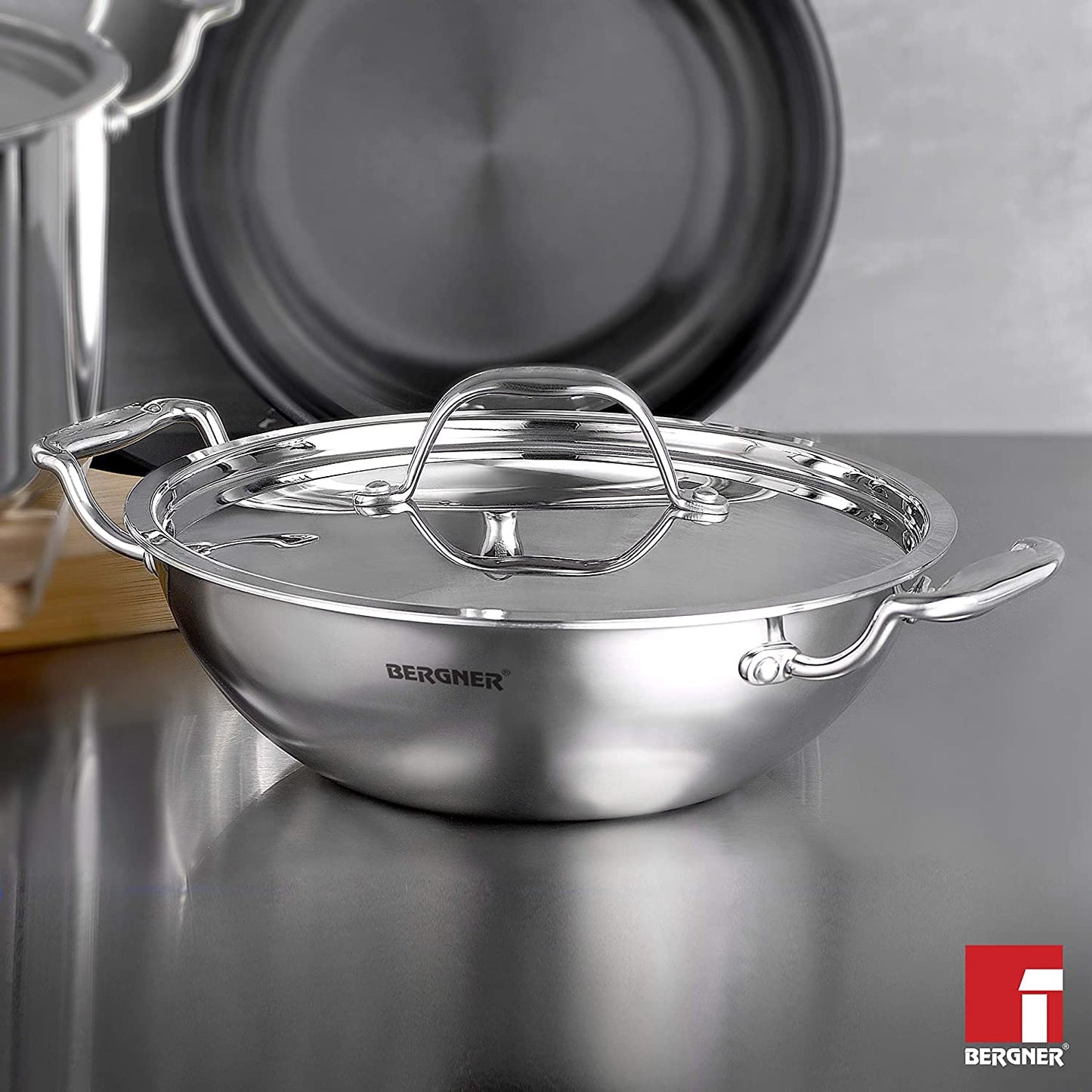 Bergner Argent Triply Stainless Steel Kadhai with Stainless Steel Lid, 20 cm, 1.5 Liters, Induction Base, Silver